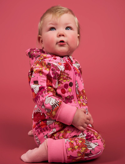 Mängulise Muumi mustriga pehme üldriie hoiab beebid mugavalt. Sellel on kapuuts, pikk tõmblukk, mis lihtsustab riietumist, ja üleskeeratavad mansetid varrukatel ja säärte otstes.
