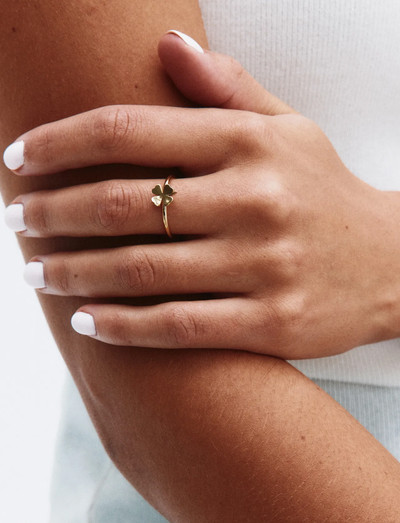 Stiliseeritud neljaleheline ristik ehivad seda õrna paelaga sõrmust. Läikiv 14K kullatud kate lisab luksuslikkust. Valmistatud roostevabast terasest, see ese on ka veekindel ja niklivaba.