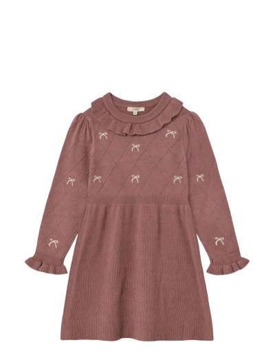 Õrn kudumiskleit, mida kaunistavad armsad lipsukesed, on võluv lisa igasse garderoobi. Pikkade varrukatega kleidil on figuuri rõhutav vöökoht, mille soonikdetailid loovad kergelt laieneva silueti. Volangid kaelusel ja kätistel lisavad naiselikkust. Valmistatud LENZING™ ECOVERO™ viskoosist, mis on saadud vastutustundlikult majandatud metsadest ja toodetud väiksema keskkonnamõjuga.