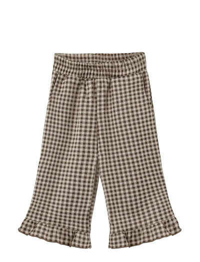 Long pants in soft sweat fabric with checkered pattern. The pants have a loose fit with elastic at the waist and slanted pockets on the sides. The pants have a ruffle at the bottom which makes them cute and feminine. The pants cut at the ankles so they can easily be worn in cold months.