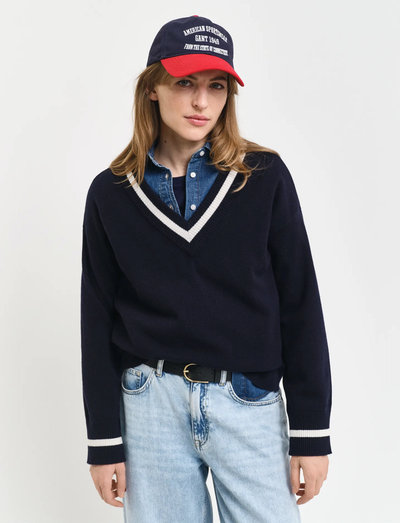 See V-kaelusega kampsun on valmistatud ülipeenest lambavillast ning on pehme ja mugav. Seda kaunistavad soonikdetailid kaelusel, kätistel ja allääres, mis rõhutavad selle klassikalist disaini. Tavaline lõige muudab selle mitmekülgseks lisandiks igasse garderoobi, samas kui tagasihoidlik logo tikand varrukal lisab peent stiili.
