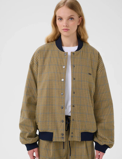 Klassikaline bomber-stiil kohtub sellel kerges jakil peene ruudumustriga. Soonikkoes krae, mansetid ja alläär tagavad mugava istuvuse ja retrohõngu. Nööpidega esikülg lisab mitmekülgsust, muutes selle suurepäraseks kihiliseks rõivaesemeks üleminekuhooajaks.
