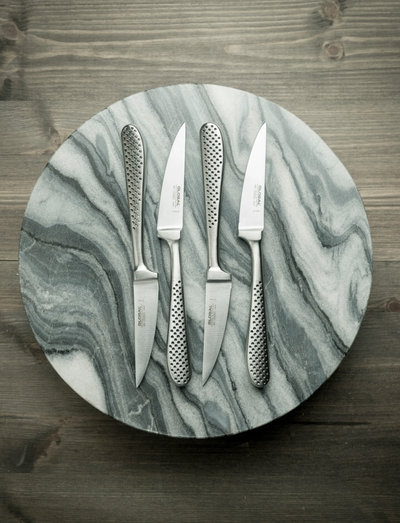 Maitske ja katke laud Globali söögiriistadega. Terava praadinoaga saate igapäevase pitsa sama lihtsalt läbi lõigata kui pühapäevase prae. Nuga müüakse eraldi, aga ka 4-pakendina ning kahvlite ja nugadega söögiriistade komplektidena. Soovitatav on käsipesu.