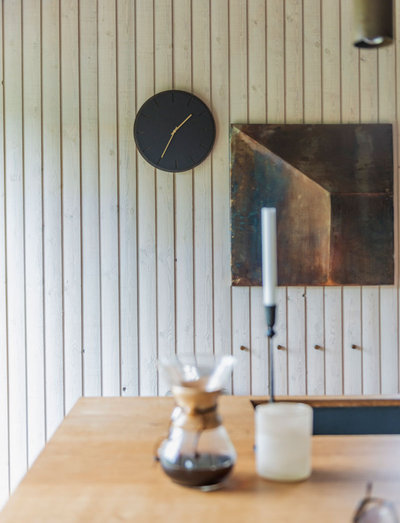 Seinakella minimalistlik disain saavutab väga rahuliku ilme tumedast tammespoonist taustaga, mis on kaetud musta linoleumiga. Puit lisab mustale linoleumile soojust koos nikerdatud tunninäidikutega ning ümara kellatahvli iseloomu määrab see, milliseid kellamärke soovite sellega koos kasutada.