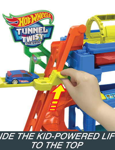3+ AastadHot Wheels City Tunnel Twist Car Wash lisab värvivahetustegevusele uuendusliku vett pritsiva tunneli! Lapsed sõidavad Hot Wheels Colour Shifteri autoga sissepääsu juurde, kus nad sõidavad lastemootoriga liftiga ülemisele korrusele. Sõida pöörlevasse autopesutunnelisse, kus auto kastetakse väga sooja veega ja näed, kuidas auto dekoor koheselt muutub! Sõitke rambist alla läbi vahurulli ja lööge tolmuimeja peale, et detailide viimistlemine lõpule viia. Lõpuks viska end jääkülma veega kastmisjaama, kus auto dekoor muutub tagasi oma algseteks värvideks. Korda seda uuesti ja uuesti. Värvid ja kaunistused võivad erineda.