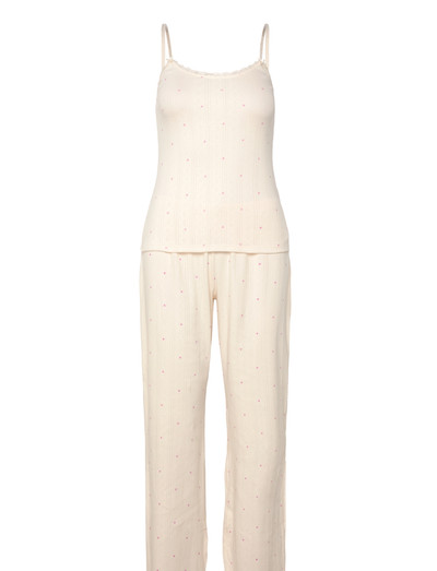 See topi ja pükste komplekt pakub lõõgastavat istuvust mugavaks oleskeluks. Topil on õrn pitskaunistus, pükstel aga pehme, langev siluett.