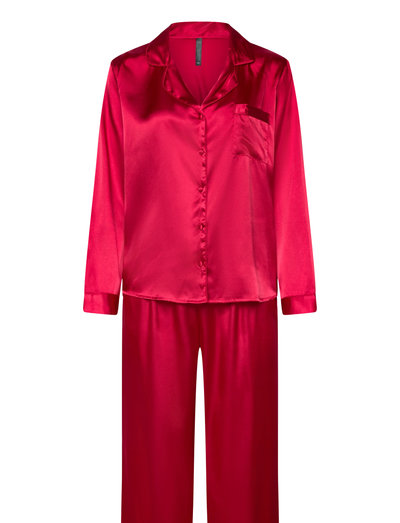 See satiinist pidžaamakomplekt on nahal luksuslik. Pikkade varrukatega ülaosal on eest nööbitav kinnitus ja rinnatasku, samas kui sobivad püksid tagavad lõõgastava istuvuse, et tagada ülim mugavus.