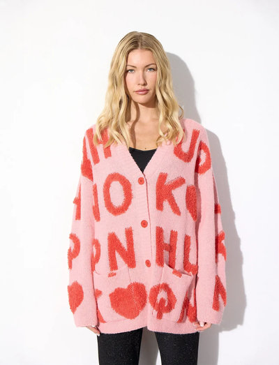 Hunkøn Jenny Cardigan is a soft and cozy knit with a relaxed, oversized fit.It features a bold all-over logo pattern, button closure, and front patch pockets.The dropped shoulders and wide sleeves add to its casual silhouette.Note: As with all knitwear, the fit may soften and shape slightly with wear.Jenny Cardigan is 50% Polyester, 40% Nylon, 10% Wool.