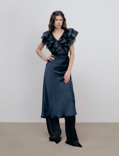Volangid lisavad sellele varrukateta topile elegantsi. Sellel on meelitav siluett ja vöökohta rõhutav seotav vöö. Ideaalne pidudeks või erilisteks sündmusteks.