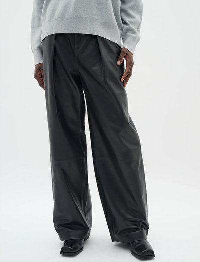 Nendel pükstel on laia siluetiga säär, mis loob moodsa ja elegantse välimuse. Disainil on struktureeritud vöökoht ja peened detailid, mis tõstavad üldist stiili. Kombineeri sisse pistetud pluusiga, et saada šikk komplekt.