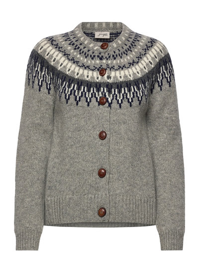 See kootud kardigan on valmistatud 100% villast ja sellel on võluv rahvapärane muster ümber ikke. Sellel on pikad varrukad, sirge, veidi lühike ja lõdvalt langev lõige ning eest kinnitatakse see suurte puiduimitatsiooniga nööpidega.
