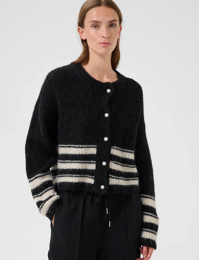 See kootud kardigan lisab tekstuuri ja sellel on eest nööbitav esiosa. Triibulised detailid lisavad visuaalset elementi, muutes selle mitmekülgseks kihiliseks rõivaesemeks.