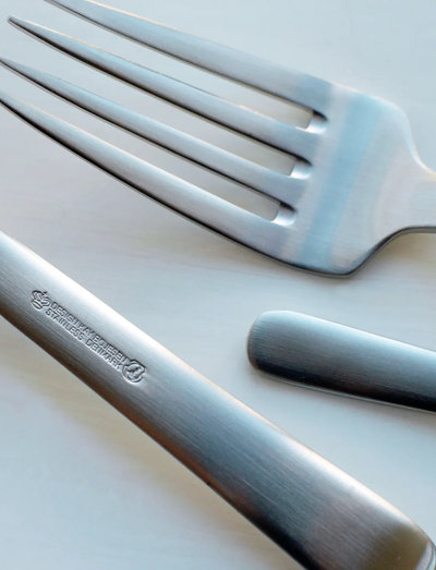 The travel set contains Kay Bojesen's lunch knife and fork as well as the small dessert spoon, which measure 18, 17 and 15 cm respectively. The cutlery is in a practical metal box, which is easy to clean between uses.