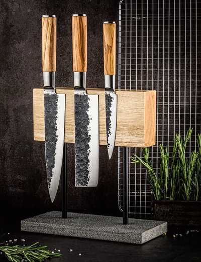 Stiilne noaplokk, mis toob esile teie kaunid noad - hädavajalik kaunilt kujundatud teraga nugade jaoks. See plokk on kasutatav mõlemalt poolt ja on valmistatud tammepuidust, millel on naturaalne kivipõhi. Kaasas on nii musta kui ka hõbedase värvusega pulgad, mille kujunduse saate ise valida.