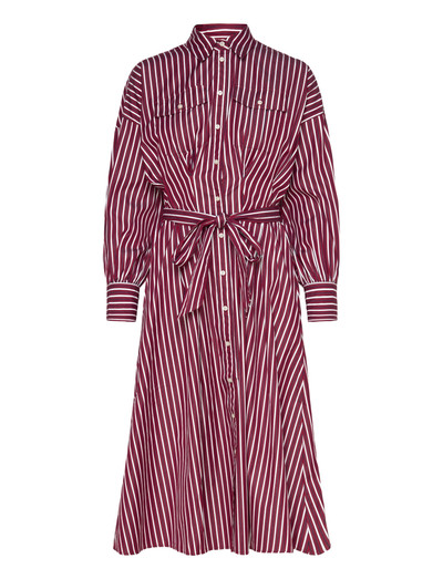 Seotav vöö rõhutab selle triibulise särk-kleidi vöökohta, luues meeldiva silueti. Nööpidega esikinnis ja broadcloth-kangas pakuvad klassikalist ja viimistletud välimust, samas kui rinnataskud lisavad praktilisust.