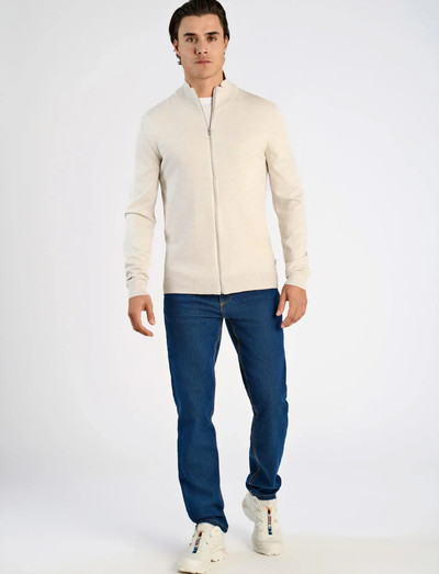 Cardigan with stand up collar and zipper closure. Made with EcoVero yarns; containing recycled fibers