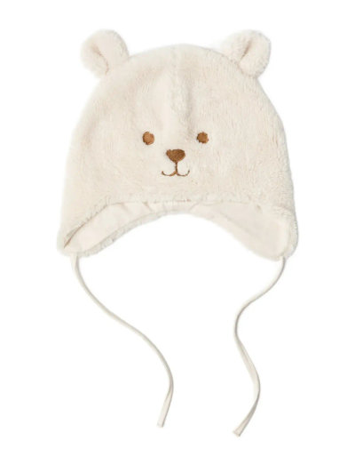 Soft hat in pile with a lining in jersey, sewn-on ears, embroidery at the front and tie bands.