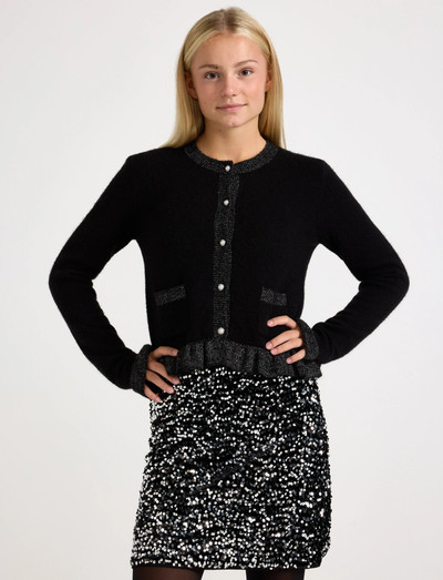 Pehme kootud kangas saab selle kardiganiga võluva uuenduse, millel on õrnad volangääred. Lurex detailid lisavad sära, samas kui eest nööbitav esiosa võimaldab seda hõlpsalt kihiti kanda. Sellel on ka kaks väikest taskut.