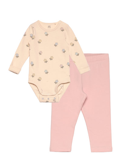 See armas komplekt sisaldab pikkade varrukatega bodyt, millel on lilleprint, ja sobivad leggingsid. Bodyl on ümmargune kael ja nööbid lihtsaks riietumiseks. Leggingsid on pehmed ja mugavad, ideaalsed igapäevaseks kandmiseks.