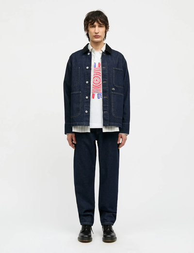 See orgaanilisest puuvilladenimist tööjope on avara lõikega, mis võimaldab mugavalt kihilist riietust. Jope on disainitud nööbitava esiosa, silmapaistva velvetist krae ja praktiliste taskutega, mis teeb sellest mitmekülgse täienduse igale garderoobile.