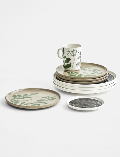 Seda väikest taldrikut kaunistab valge ja musta räsymatto muster. räsymatto (rättivaip) mustri kujundas maija louekari 2009. aastal. see kujutab lihtsa rättivaiba igapäevast ilu aiamaja põrandal.