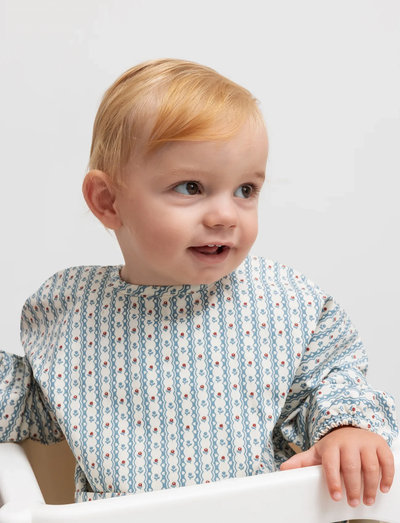Long-sleeved bib. The bib has a practical front pocket, elasticated cuffs, and snap button closure at the neck. Made from a water-repellent material that is easy to wipe clean.