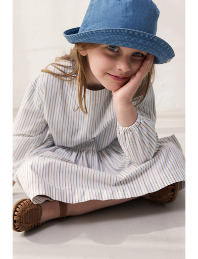 Long-sleeved dress with a loose fit. The dress has two front pockets and button closure at the back. The length goes above the knee.