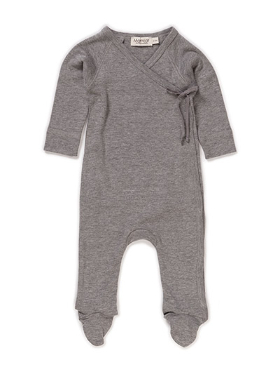 Long-sleeved wrap romper with footies. The romper is closed with both snap buttons and ribbons.