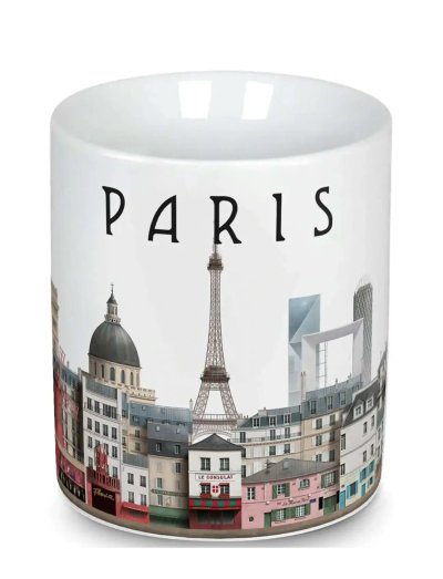 Classic coffee mug made of German porcelain with Paris' most iconic buildings beautifully wrapped around.