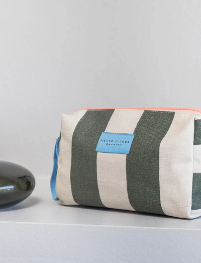See kosmeetikakott sobib ideaalselt kasutamiseks kodus või reisil ning pakub stiilset viisi oma esmatarbekaupade korrastamiseks. Valmistatud vastupidavast puuvillasest lõuendist, sellel on triibuline disain ja mängulised värviaktsendid lukul ja etiketil. Siseküljel on mustust ja vett hülgav vooder nelja taskuga, samas kui eemaldatav põhjaosa tagab, et see seisab püsti. Lai tõmblukuga ava tagab lihtsa juurdepääsu.