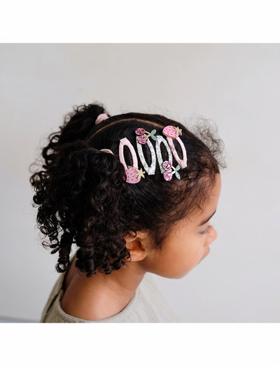 Need armsad juukseklambrid lisavad igale soengule veidi armsust. Komplektis on kaks paari klõpsuga klambreid, millest igaüks on kaunistatud võluvate puuviljadetailidega. Ühel paaril on sädelevad kirsid, teisel aga armsad maasikad, mõlemad kinnitatud värvilise satiinpaelaga.