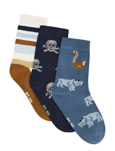 3-pack socks from Minymo. The pack includes 3 pairs of socks: two with prints and one with multicolored stripes. Certified acc. to OEKO-TEX® STANDARD 100 Cert. No. 2276-364 DTI