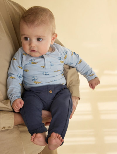 Long-sleeved bodysuit from Minymo. The bodysuit has an all-over print. It fastens with press studs between the legs, and it also has two buttons at the front near the collar. The bodysuit is made of a cotton blend. Certified acc. to GOTS - organic CERES-0366 Certified acc. to OEKO-TEX® STANDARD 100 Cert. No. 2276-364 DTI