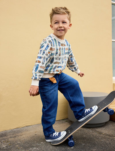 Sweatshirt from Minymo with an all-over print of skateboards. The sweatshirt features ribbed cuffs at the sleeves, bottom, and neckline. Certified acc. to GOTS - organic CERES-0366