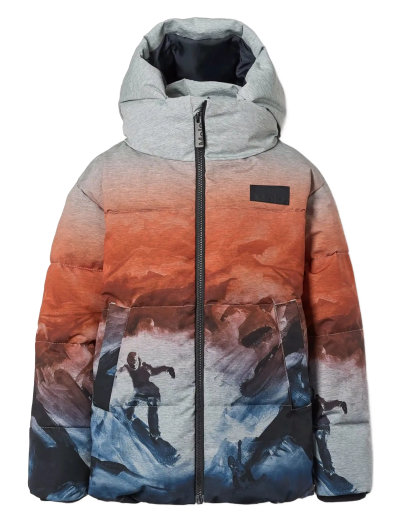 VeekindelThis jacket is made of recycled polyester and features a print. It is designed with a practical zip closure, high collar, detachable hood, front pockets, an inner pocket, ribbed cuffs, and adjustable elastic at the bottom to help against the wind. A large reflector on the back increases visibility in traffic.