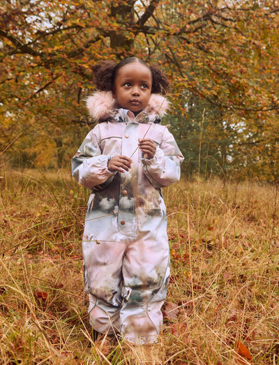 VeekindelThis wind and waterproof snowsuit from Molo is made of recycled nylon. It has a detachable lined hood with a detachable faux fur trim, front pockets with wind flaps, and front zippers with storm flaps and chin guard. Internal elastic straps and elastic at the sleeve and leg openings ensure a good fit and keep snow, rain, and wind out. Furthermore, it is lined with recycled polyester fleece in exposed areas and padded with 3M™ Thinsulate™ for optimal heat retention.