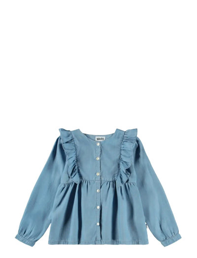 This shirt features a soft, lightweight denim-like design with charming ruffles along the chest and shoulders. It includes long sleeves with cuffs and a button-down front for easy dressing. The relaxed fit ensures comfort, making it suitable for both everyday wear and special occasions, offering a delightful blend of style and practicality for any young wardrobe.