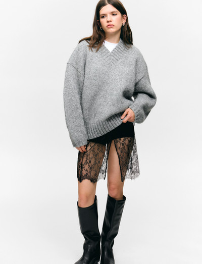 A low-rise wrap skirt crafted from delicate lace with a sheer finish. Designed with a knee-length silhouette and slim waist ties that fasten at the side for an adjustable fit.