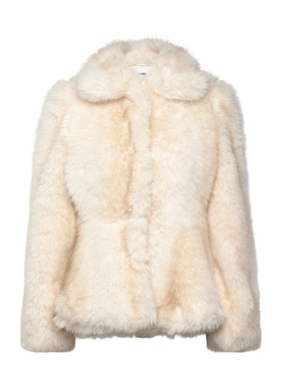 A jacket crafted from soft faux fur, designed for a regular fit. It features a rounded collar, a peplum hemline for a defined silhouette, and discreet in-seam pockets. Finished with a hidden hook-and-eye front closure and full lining for comfort.