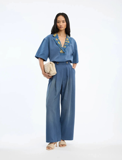 Tikitud detailid tõstavad esile selle lühikeste varrukatega topi, mis on valmistatud pehmest teksariidest. Disainil on avatud krae ja kerge, kastikujuline lõige, mis teeb sellest mugava ja stiilse valiku.