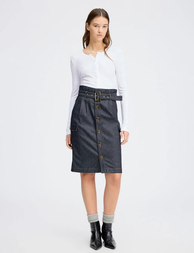 See kõrge vöökoha ja eemaldatava vööga teksaseelik pakub meelitavat siluetti. Esiküljel olev nööpkinnitus ja silmatorkavad klapptaskud lisavad sellele mitmekülgsele rõivale funktsionaalseid ja stiilseid detaile.