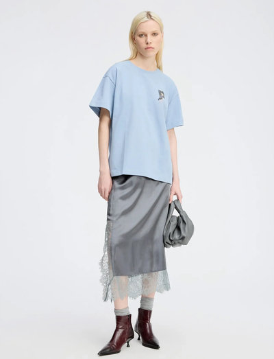 Sellel lühikeste varrukatega T-särgil on lõdvestunud lõige ja klassikaline ümar kaelus. Esikülge kaunistab kunstiline lillemuster, tagaküljel on graafiline embleem.
