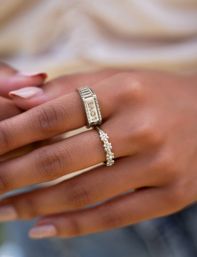 Õrnad lillelised aktsendid ümbritsevad seda sõrmust, pakkudes loodusest inspireeritud võlu. Iga lille sisse on paigutatud pisikesed kivid, mis lisavad sellele ehtele peent sära.