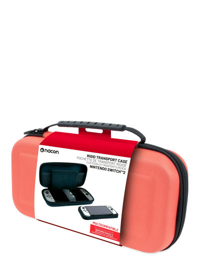 Rigid transport case, compatible with Nintendo Switch™2, Switch™ OLED, and Switch™ Lite consoles via a removable stand. Its durable design and materials protect your console from damage, while an inner compartment offers convenient storage for your mains adapter and games, ensuring secure transport.