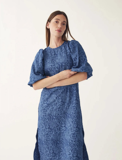 A-lõikeline siluett kohtub modernsete detailidega selles žakaarkangas kleidis. Volüümikad puhvvarrukad ja küljelõhikud täiendavad seda voolavat disaini.