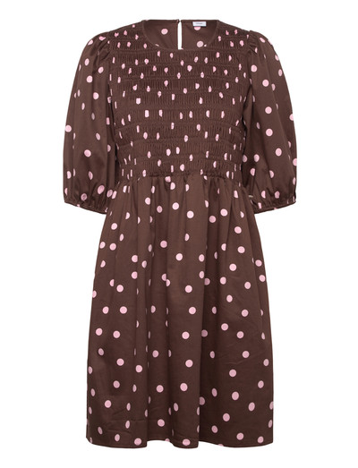 Sellel lühikesel kleidil on suitsukangast pihik ja mängulised täpid, mis tagavad mugava ja stiilse istuvuse. Disainil on lühikesed puhvvarrukad, mis lisavad üldisele siluetile volüümi ja elegantsi.