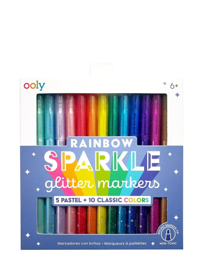 6+ AastadSet of 15 from the Rainbow Sparkle Glitter Markers range, perfect for art, school and creative projects. Set includes 10 classic colors and 5 pastel shades 15 markers are included in all Designed with a rounded tip