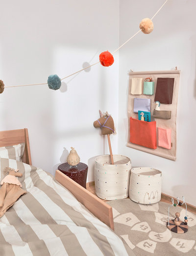 The Saga Wall Storage is a colorful and functional storage solution designed for kids' rooms. Featuring multiple compartments in fun, vibrant colors, it’s perfect for organizing toys, books, and small accessories. Made from durable fabric with a PE coating, it attaches easily to the wall, helping to keep things tidy while adding a playful touch to the room.