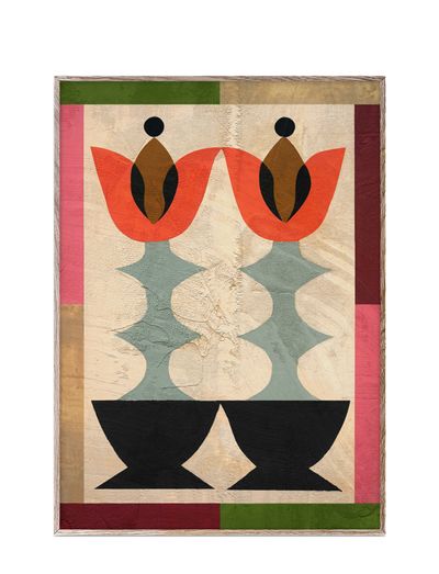 Referencing the graphic forms of Mexican pop art and the vibrancy of nature in her homeland, Berenice Hernandez has created Flor De Luz (Light Flower). Two hand-painted flowers stretch up from black pots with an expression that is both curved yet bold – the strong orange flowers sitting against a neutral, yet textured canvas backdrop mixed with raw cotton fibers and glue. A colorful border in red, pink and green up-lifts the composition, creating an art print that is full of playful colours and forms. An Art print / poster manufactured in Denmark from Environmentally certified materials and production.