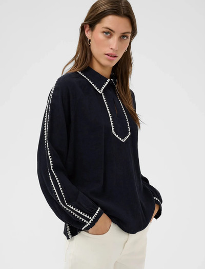 Tavaline lõigeKontrastse kandiga viimistletud pikkade varrukatega pluus pakub rafineeritud, kuid lõdvestunud siluetti. Klassikaline krae ja peened detailid varrukatel lisavad elegantsi, muutes selle mitmekülgseks rõivaesemeks erinevateks puhkudeks.